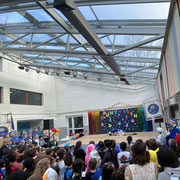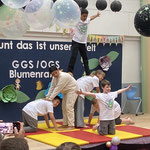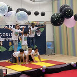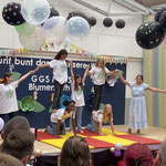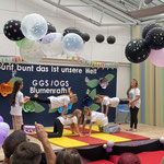 Am 6.7.2025 haben unsere 4. Klassen ein tolles Abschlussfest gefeiert! Es gab viele Überraschungen. Zunächst begann das Fest mit einer Rede des Schulpflegschaftsvorsitzenden. Er bedankte sich bei den Klassenlehrerinnen für die Arbeit mit den Kindern in den letzten vier Jahren. Anschließend kam ein Eiswagen für die Kinder auf den Schulhof gefahren. Neben diesen kühlen Köstlichkeiten, hatten die Eltern auch ein großes Buffet gezaubert. Im Nebenraum des Forums lief eine Fotoshow, die Bilder aus den letzten vier Jahren zeigte. Als Höhepunkt zeigten die Kinder beider Klassen eine tolle Akrobatikshow mit Pyramiden und haben eigenständig einstudierte Tänze aufgeführt.