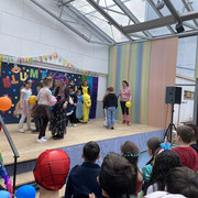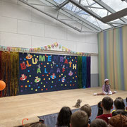 Anschließend haben wir in den Klassen weitergefeiert und in der Pause vielfältig kostümiert gespielt. Zum Schluss erwartete uns noch ein besonderer Programmpunkt auf der Bühne. Unsere Schülerin Pia tanzte ihren Solotanz für uns und bekam einen großen Applaus!