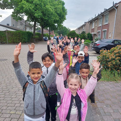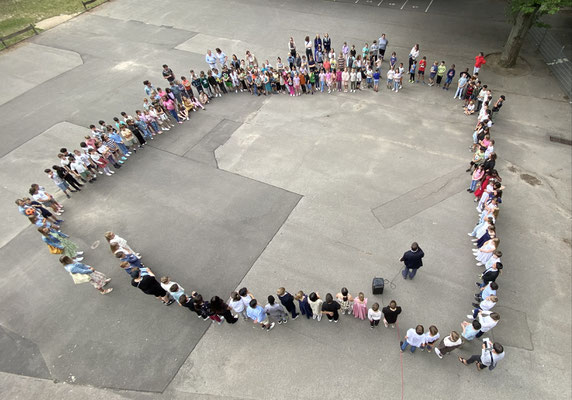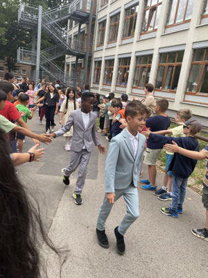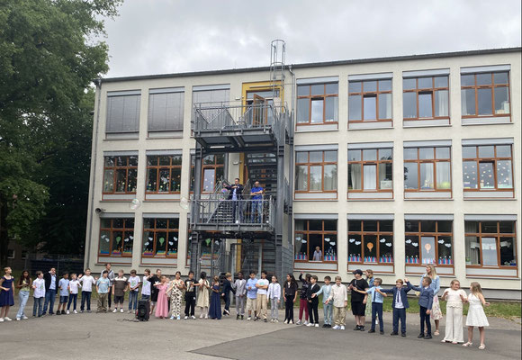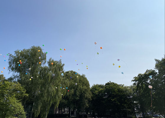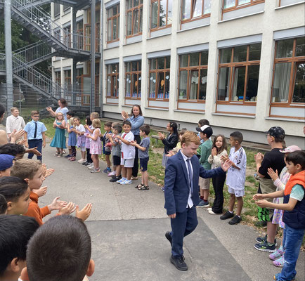 Nach der Pause konnten sich alle Kinder und das Lehrpersonal von den Kindern der 4. Klassen auf dem Schulhof verabschieden. Gemeinsam haben die 4.-Klässler:innen ein Abschiedslied gesungen. Dazu flogen bunte Seifenblasen über die Köpfe der Zuschauer:innen hinweg. Das ein oder andere Tränchen floss dabei, sowohl bei den Kindern als auch bei den Erwachsenen, spätestens aber auch als es durch ein Spalier zurück ins Schulgebäude ging.