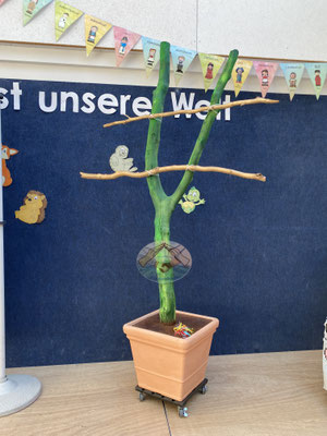 Um zu veranschaulichen, dass wir ein friedliches Zusammenleben wünschen, dürfen Kinder, die mit unseren Streitschlichter-Kindern einen Streit geklärt haben, ein buntes Bändchen an unseren neuen Friedensbaum hängen.